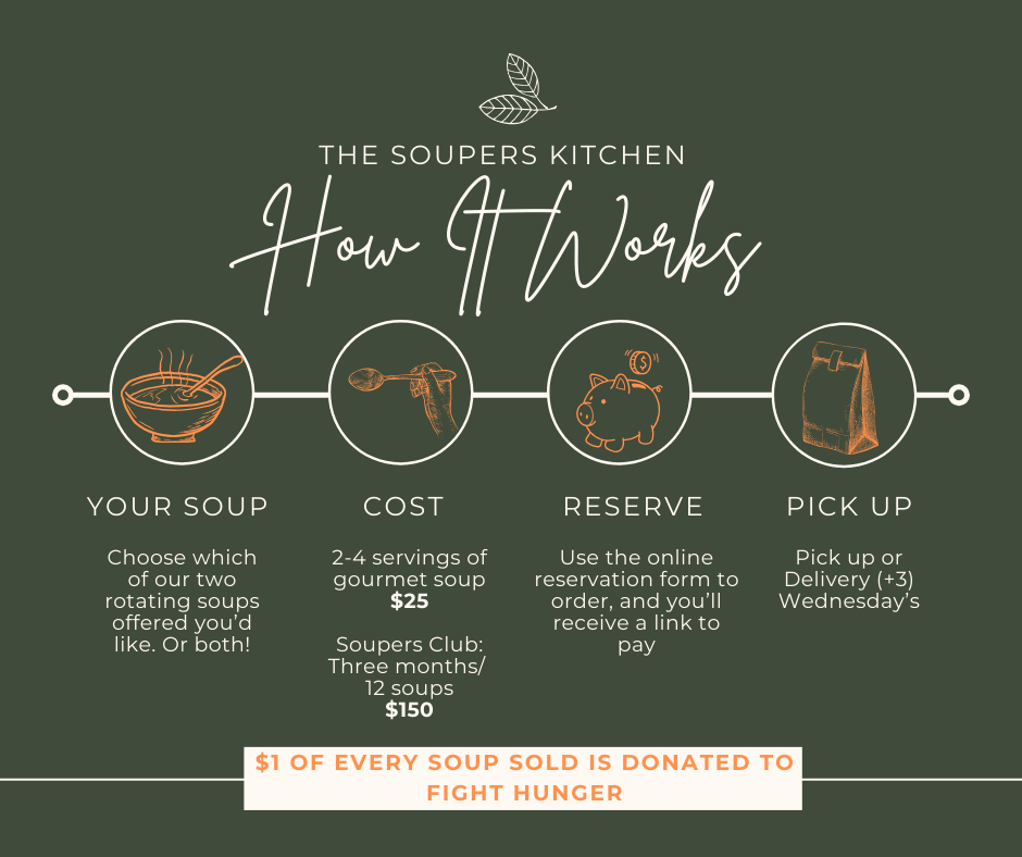 Soup has been a staple throughout history. A pot full of bubbling vegetables and broth invites a sort of wonder and excitement, the anticipation of what’s to come and the aroma that fills the house. Once served, its glory gets to be devoured either by spoon or bread, over wonderful conversations with friends and family, and it always feels like a warm hug from the inside. That feeling is what led us to create The Soupers.